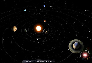 Detto questo, i pianeti in questi giorni sono ben distribuiti ottorno al Sole, come risulta dalla mappa qui sopra, che mostra la loro posizione il 21 dicembre 2012. Quindi, questa volta non c'è affatto il grande allineamento. In particolare, Giove e Saturno, di gran lunga i corpi più massicci, dopo il Sole, sono quasi in direzioni opposte.